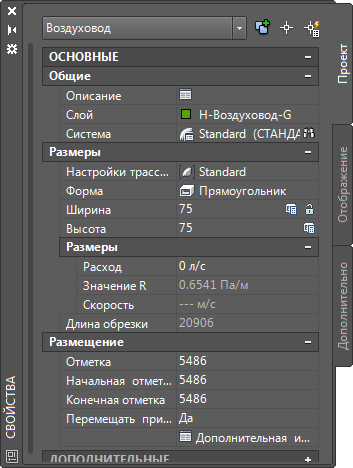 Изменение основных свойств воздуховода с помощью палитры "Свойства".