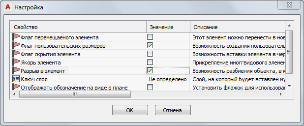 | Разрыв в элемент | Настройка предусмотрена только для мультивидовых элементов. Позволяет разорвать многовидовой элемент для преобразования в другой объект. |
