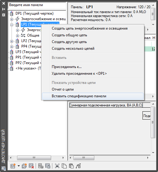 Создание спецификации панели в текущем чертеже с помощью Диспетчера цепей.
