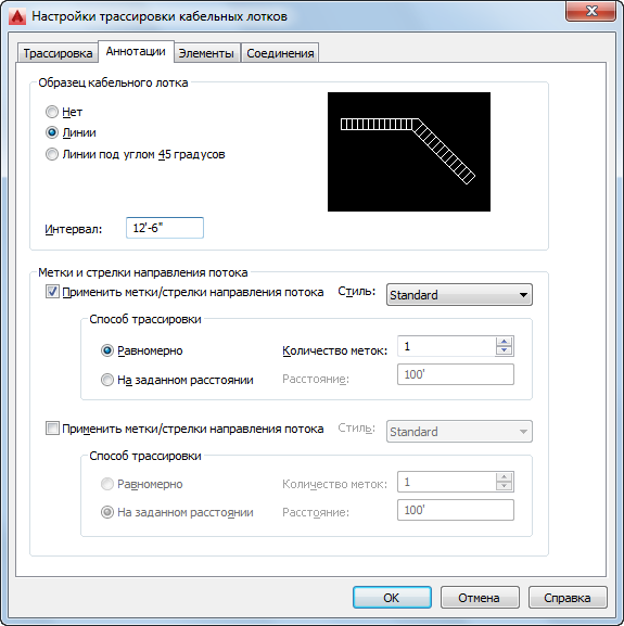 Можно задать метки или стрелки направления движения потока, которые будут добавлены к участкам кабельного лотка во время его построения. Можно также указать применяемый образец штриховки. Можно задать штриховку вертикальными линиями или с наклоном в 45 градусов, а также указать интервал между линиями.