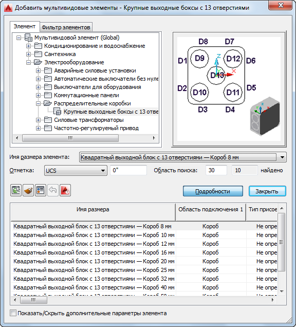 В диалоговых окнах "Добавить многовидовые элементы" и "Изменение многовидового элемента" можно также воспользоваться вкладкой "Фильтр элементов" для задания свойств, чтобы осуществить в семействе элементов поиск конкретного размера элемента. Нажав кнопку "Подробности", можно просмотреть доступные в семействе размеры элементов. Доступные размеры представлены в удобной форме в таблице размеров элементов. Чтобы в таблице отображались все параметры, установите флажок "Показать/Скрыть дополнительные параметры".