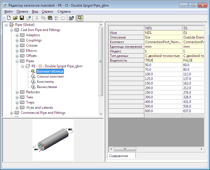 Каталоги элементов AutoCAD MEP, как правило, разделены на разделы, которые объединены в группы по элементам. Внутри глав содержатся семейства элементов, сохраняющие отдельные размеры элементов. Семейство элементов представляет собой группу размеров соответствующих элементов. В следующем примере демонстрируется организация каталога элементов труб.