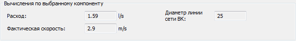 Раздел "Вычисления по выбранному компоненту" диалогового окна "Размеры линии водоснабжения" содержит не подлежащие редактированию вычисленные значения, относящиеся к выбранному компоненту.