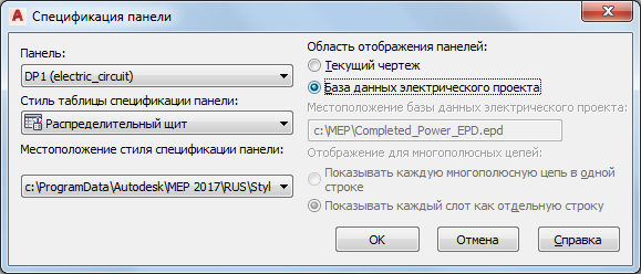 Чтобы создать спецификацию панели, которая не находится в текущем чертеже, следует указать базу данных электрического проекта (если она еще не указана) на вкладке "База данных электрического проекта" диалогового окна "Настройки электрооборудования".