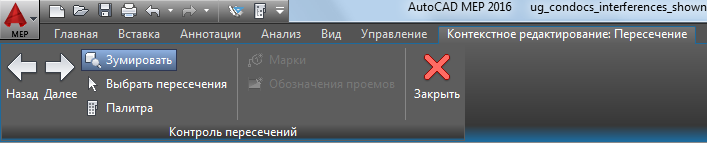 | решить проблемы пересечений | использовать инструменты или команды для добавления или изменения объектов MEP Прим.: Решение проблем пересечений не приводит к автоматическому удалению их из списка и с чертежа. Необходимо либо снова запустить функцию анализа пересечений, либо удалить пересечения вручную. Помимо этого, необходимо повторно выполнить анализ для просмотра новых пересечений, которые могли возникнуть при добавлении объектов.