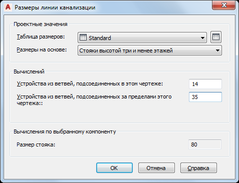 Если определение размеров было основано на стояках, диалоговое окно "Размеры линии канализации" отображает результаты определения размеров для имеющихся в чертеже стояков.