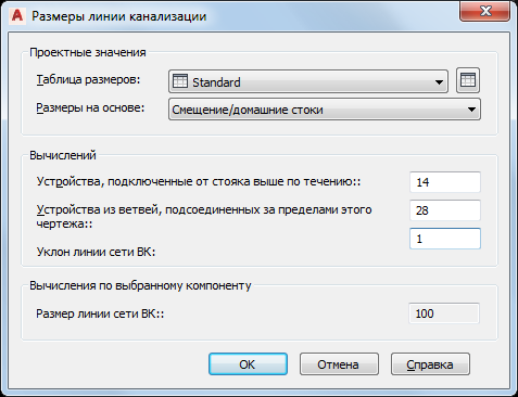 Расположенные в нижней части диалогового окна "Размеры линии канализации" разделы, не подлежащие редактированию, содержат результаты вычисления размеров.