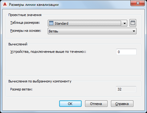 Если определение размеров было основано на ответвлениях, диалоговое окно "Размеры линии канализации" отображает результаты определения размеров для имеющихся в чертеже ответвлений.