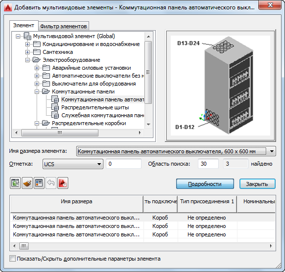 Добавление электрооборудования выполняется с помощью инструментов, имеющихся в палитре инструментов "Оборудование" в группе палитр инструментов электрической системы. В процессе работы выбирают инструмент и в диалоговом окне "Добавить многовидовые элементы" выбирают элемент и конфигурируют его свойства, а затем добавляют этот элемент в чертеж.