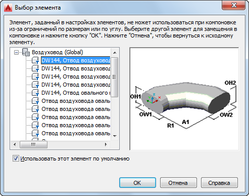 Диалоговое окно "Выбор элемента" с элементами воздуховода, упорядоченными по типу формы