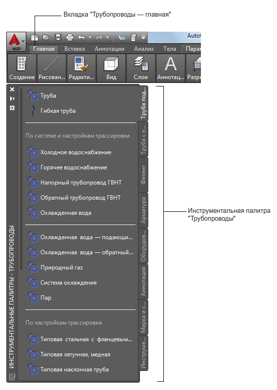 При работе в организации широкого профиля и выполнении нескольких различных задач проектирования, таких как разработка системы ОВК и трубопроводной системы, использование рабочих пространств особенно удобно. Их можно использовать для сохранения конфигураций пользовательского интерфейса, подготовленного для выполнения разных задач. После создания рабочих пространств при необходимости можно быстро переключаться между ними.