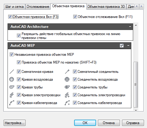Совет: Можно воспользоваться ярлыком, нажав сочетание клавиш SHIFT+F3, чтобы включить или выключить привязки AutoCAD MEP.
