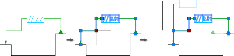 При редактировании основной выноски с помощью ручек сегмент выноски, предшествующий ручке (по направлению к стрелке), растягивается или сокращается. Другие выноски не изменяются. Местоположение рамки допусков формы и расположения изменяется в соответствии с изменением данной выноски.