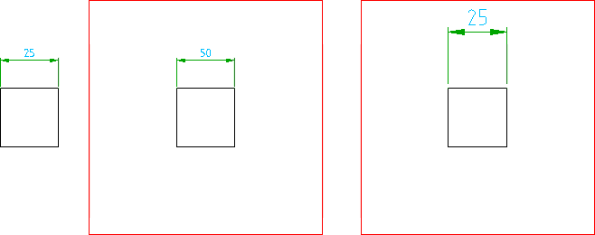 Масштабирование по длине увеличивает или уменьшает геометрию, не изменяя размер аннотаций. Масштабирование текста увеличивает или уменьшает аннотации, не изменяя размера геометрии. На иллюстрации показаны 3 квадратных пластины одного размера (25 единиц чертежа). В масштабированном фрагменте с масштабом длины 1:2 длина стороны отображается равной 50, что в два раза больше значения в единицах чертежа. Однако высота размерного текста совпадает с высотой квадратной пластины в пространстве модели. В масштабированном фрагменте с масштабом текста 1:2 длина стороны равна 25, что совпадает со значением в единицах чертежа, однако размер в два раза больше.