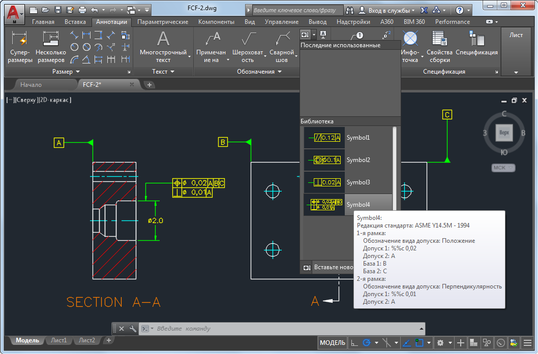 Обозначения можно предварительно настроить и сохранить в библиотеке обозначений для повторного использования. Библиотека обозначений отображается в диалоговом окне, которое появляется при вставке обозначения в чертеж. При выборе обозначения из библиотеки все другие сведения, которые обычно вводятся в диалоговом окне, заполняются автоматически.