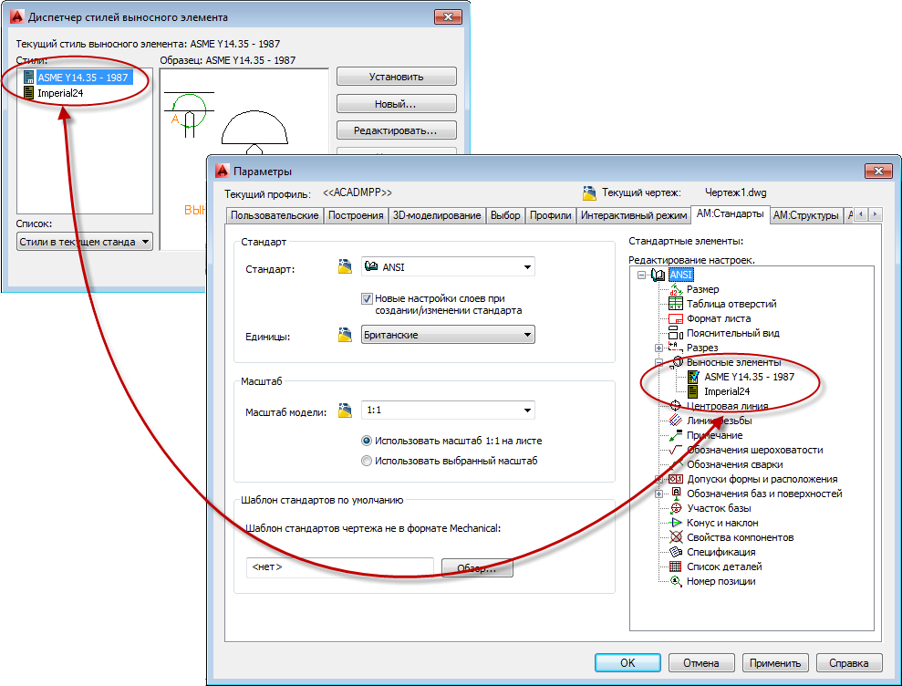 Параметры, определяющие представление объектов AutoCAD Mechanical, сохраняются в именованный набор параметров, называемые стандартом оформления. Принципы применения стилей выносного элемента к объектам AutoCAD (выносным элементам документации модели) не совпадает с тем, как они применяются к объектам AutoCAD Mechanical (выносные элементы AMDETAIL). Соответственно,