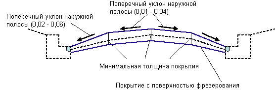 Если звенья покрытия слишком пологие, толщина покрытия увеличивается так, чтобы обеспечить построение минимально допустимых поперечных уклонов. Если в результате получается слишком большое перекрытие, могут выполняться дальнейшие регулировки и фрезерование. На следующей диаграмме показано покрытие в случае фрезерования: