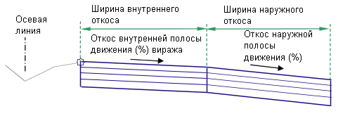 Данный элемент конструкции создает набор внутренних и внешних полос, которые могут иметь различные откосы. Внутренние полосы вставляются снаружи от точки привязки с использованием поперечного уклона "Вираж внутренней полосы". Если в пикете вираж не определен, используется значение "Стандартный поперечный уклон внутренних полос в %". Наружные полосы вставляются снаружи от конца внутренних полос с использованием поперечного уклона наружной полосы виража или значения "Стандартный поперечный уклон наружной полосы в %".