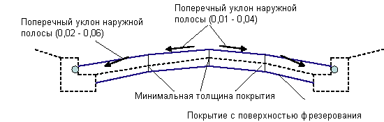 Если звенья покрытия слишком пологие, толщина покрытия увеличивается так, чтобы обеспечить построение минимально допустимых поперечных уклонов. Если в результате получается слишком большое перекрытие, могут выполняться дальнейшие регулировки и фрезерование. На следующей диаграмме показано покрытие в случае фрезерования.