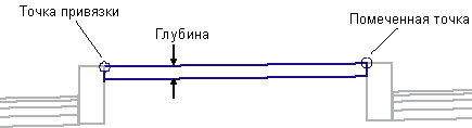 Верхний край звена разделительной полосы вставляется между точкой привязки и помеченной точкой. Если заданное значение "Глубина" не равно нулю, нижний край звена разделительной полосы вставляется параллельно верхнему краю, для замыкания формы вставляются вертикальные звенья.