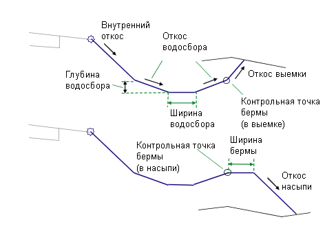 Элемент конструкции создает звенья для внутреннего откоса водосбора и выход водосбора в контрольной точке. Если имеется профиль, ширина внутреннего откоса изменяется так, чтобы при фиксированной глубине водосбора оставался фиксированным его профиль. Если контрольная точка водосбора находится в выемке, пересечение выхода на рельеф рассчитывается на целевой поверхности при данном значении "Откоса выемки". Если рассматривается насыпь, добавляется звено верхнего края бермы, пересечение выхода на рельеф рассчитывается на целевой поверхности при данном значении "Откоса насыпи". Если параметр "Пропустить звено, оканчивающееся выходом на рельеф" установлен в положение "Истина", звено, оканчивающееся выходом на рельеф, не вставляется. Если звено верхнего края бермы пересекает целевую поверхность, сечение ограничивается на уровне пересечения.