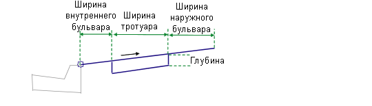 Звенья внутренней полосы с травяным покрытием, тротуара и наружных бульваров с газоном вставляются с заданным поперечным уклоном в направлении наружу от точки привязки. Полосу с травяным покрытием можно проигнорировать, если задать нулевую ширину.