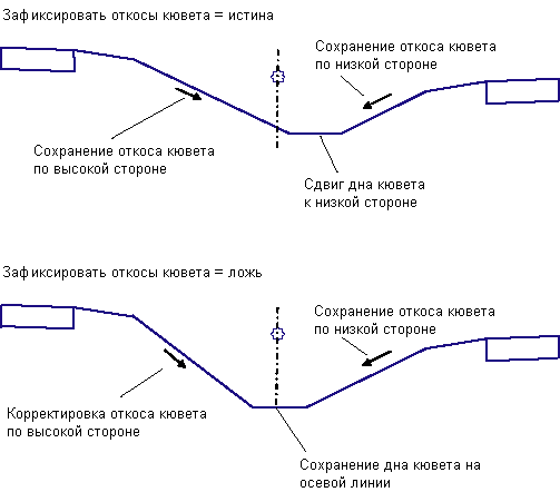 Если точки верха откоса кювета расположены на разных отметках, данный элемент определяет, следует фиксировать боковые откосы кювета и разрешить сдвиг положения кювета, или фиксировать кювет по центру и отрегулировать боковой откос по высокой стороне. |