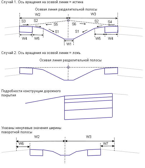 Этот элемент конструкции используется только для типов дорожного полотна с методом вращения для кромок разделительной полосы и обработкой разделительной полосы с сохранением ее формы. При использовании этого элемента конструкции с любым другим методом вращения или с обработкой искаженной разделительной полосы результат будет эквивалентен использованию кромок разделительной полосы с сохранением ее формы.