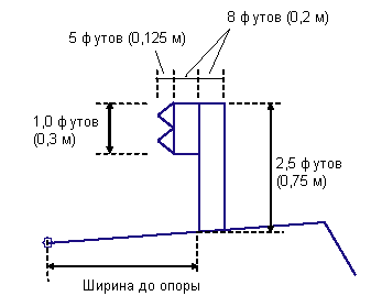 Конструкция перил может применяться для сечений насыпи, соответствующих критерию использования крутого откоса насыпи. При соответствии данному критерию значение "Ширина перил" не равно нулю, и ,если параметр "Включить перила" установлен в положение "Истина", на пикете вычерчивается конструкция ограждения. Как показано на следующей диаграмме, размеры конструкции ограждения являются фиксированными.