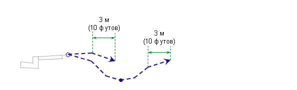 Данный элемент конструкции в режиме компоновки пунктирной линией прорисовывает решения пологого откоса как в условиях выемки, так и в условиях насыпи. Звено, оканчивающееся выходом на рельеф, удлиняется наружу на 3 метра или 10 футов по горизонтали и ограничивается стрелкой.