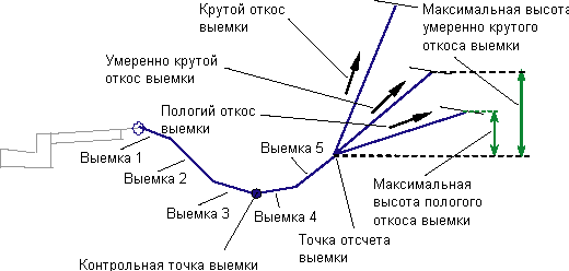 Откос выемки, который используется в случае, если звено "Умеренно крутой откос выемки" превышает значение "Максимальная высота умеренно крутого откоса выемки". |