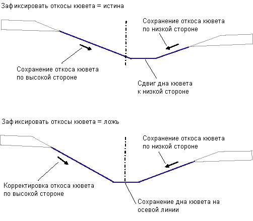 Если точки верха откоса кювета расположены на разных отметках, данный элемент определяет, следует фиксировать боковые откосы кювета и разрешить сдвиг положения кювета, или фиксировать кювет по центру и отрегулировать боковой откос по высокой стороне. |
