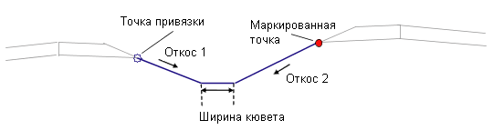 Задается местоположение точки привязки и помеченной точки. Помеченная точка может располагаться справа или слева от точки привязки. Звенья удлиняются вовнутрь от точки привязки по "Откосу 1" и от помеченной точки по "Откосу 2" до пересечения друг с другом. Если ширина кювета задана, в сторону пересечения откосов вписывается горизонтальное звено дна кювета.