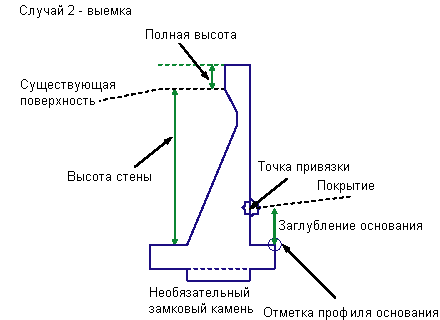 | Заглубление основания | Величина заглубления, измеряемая от верха основания до линии проектной поверхности на тыльной стороне стены в случае насыпи или до привязки в случае выемки. | Числовое |