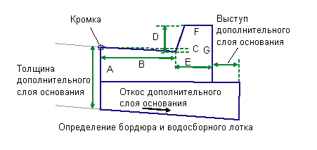 Остальные звенья бордюра с водосборным лотком вставляются на основании размеров, заданных во входных параметрах: размер А - размер F. Значения всех размеров должны быть положительными и не должны быть равны нулю. Если задана ненулевая толщина дополнительного слоя основания, дополнительный слой основания вставляется на уровне нижнего края бордюра, его ширина равна ширине выступа бордюра. Дополнительный слой основания замыкает нижнюю поверхность бордюра, см. диаграмму.