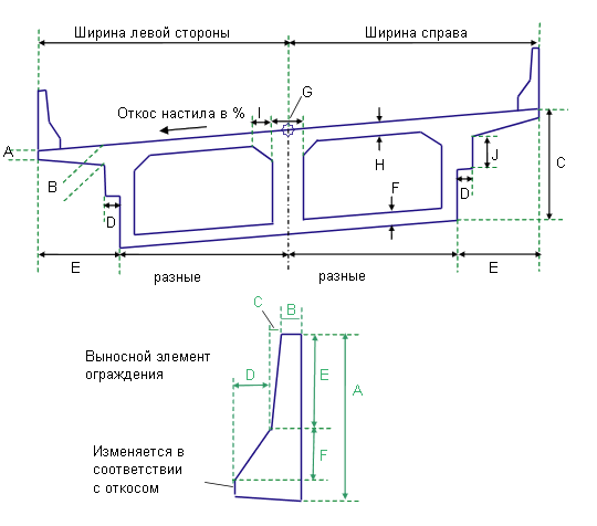 Если опция "Включить ограждения" установлена в положение "Истина", с левого и правого края настила добавляются секции одностороннего ограждения типа "Нью-Джерси". Склоны ограждения регулируются в соответствии со склонами настила.