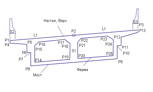 Точка привязки располагается на линии разделения между левой и правой полосами на проектной поверхности настила моста. Сечение моста строится с левой и правой сторон.