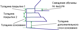 | Выступ основания справа | Расстояние, на которое слой основания выступает за кромку обочины с покрытием с правой стороны в сторону разделительной полосы. Предусматривается даже при нулевой ширине правой обочины. | Числовое, положительное |