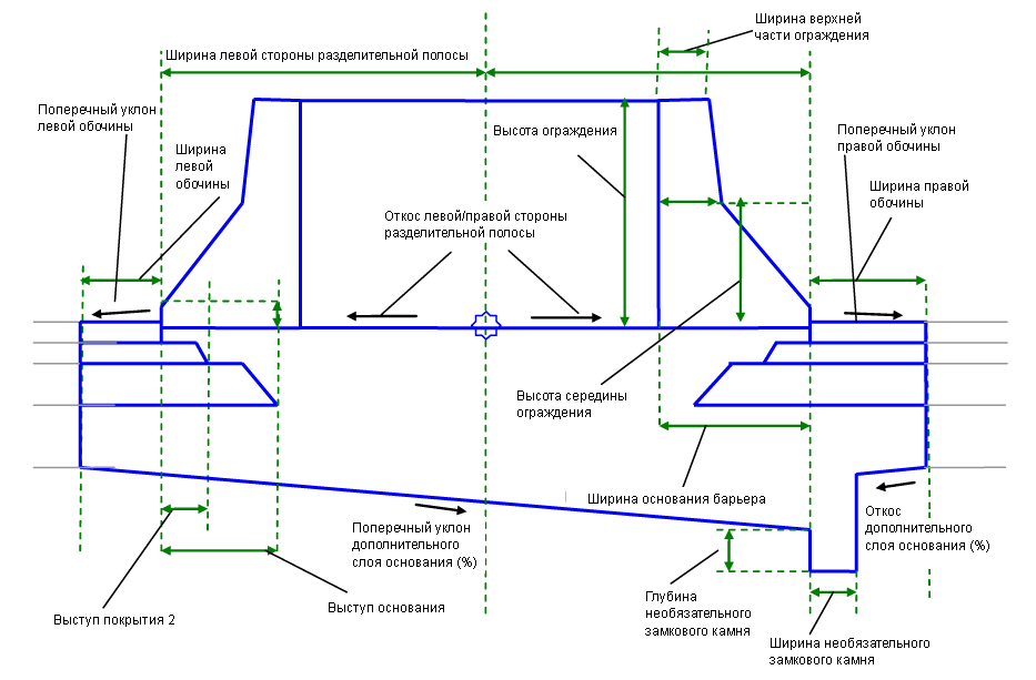 | Ширина левой стороны разделительной полосы | Ширина разделительной полосы влево от точки привязки, включая площадь ограждения. | Числовое, положительное |