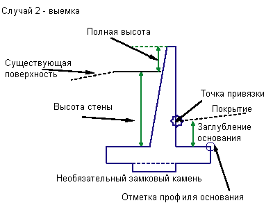 Данный элемент конструкции может вставляться отдельно для левой или правой стороны. Точки привязки различны для состояния насыпи и выемки. Для насыпи предполагается, что точка привязки находится в месте пересечения проектной поверхности и внутренней грани стены на расстоянии высоты верхнего края ниже верха стены. Для выемки предполагается, что точка привязки находится в месте пересечения проектной поверхности и внутренней грани выше верха основания на расстоянии, равном параметру "Заглубление основания". Высота стены определяется по входным значениям "Высота стены" или "Профиль".