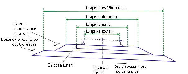 Данный элемент конструкции в режиме компоновки отображает звенья, состоящие из проектной поверхности, балласта, суббалласта и боковых откосов.
