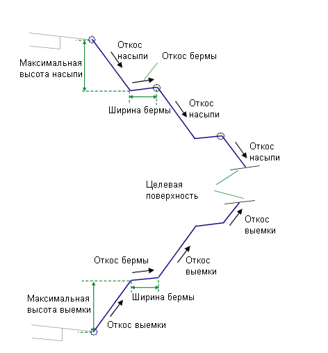 Точка привязки используется как точка исходного отсчета. Отметка точки отсчета проверяется по отношению к целевой поверхности для определение сечения - находится ли он в условии выемки или насыпи. Пересечение рассчитывается до целевой поверхности с использованием заданных значений "Откос выемки" или "Откос насыпи". Если высота пересечения превышает значение "Максимальная высота", вставляется звено со значением "Максимальная высота", и добавляется звено бермы. Точка отсчета восстанавливается к положению на внешней кромке бермы, процесс повторяется до тех пор, пока найденное звено, оканчивающееся выходом на рельеф, не будет превышать значения "Максимальная высота".