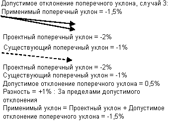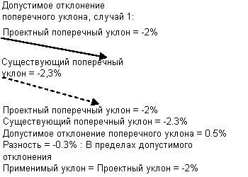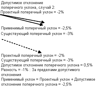 Допустимое значение отклонения от проектного значения "Поперечный уклон покрытия". Допустимое отклонение поперечного уклона не используется, если параметр "Поперечный уклон покрытия" задается как М (подробнее см. ниже в разделе "Режим"). |