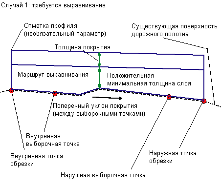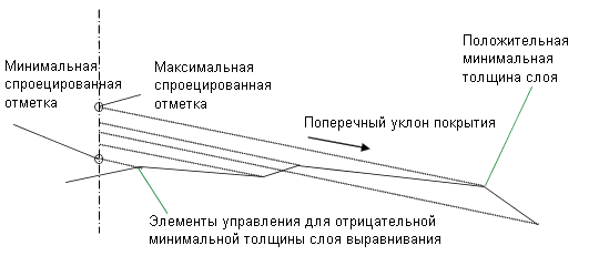 Элемент определяет, следует фиксировать верх покрытия во внутренней точке обрезки по отметке профиля коридора или установить вертикальное размещения слоя покрытия на основе значения "Минимальная толщина слоя выравнивания". |