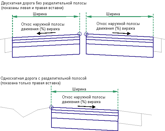 Данный элемент конструкции предназначен для создания представления поперечного сечения полосы движения, в котором для трассы базовой линии в моделировании коридора применяется значение поперечного уклона наружной полосы виража.