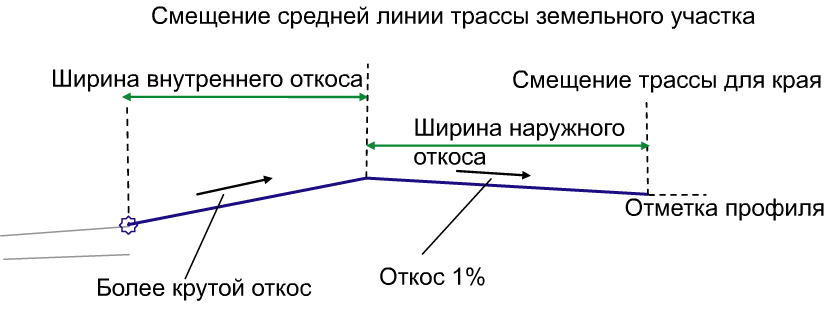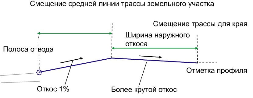 Может использоваться для переопределения фиксированного значения параметра "Ширина наружного откоса" путем привязки конечной линии земельного участка к смещенной трассе. Следующие типы объектов могут использоваться в качестве целевых для указания смещения: трассы, полилинии, характерные линии и фигуры съемки. |