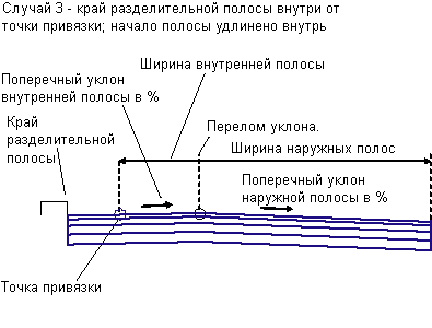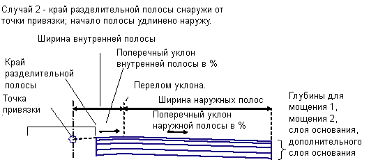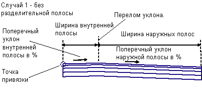 Перелом: ширина от точки привязки в наружном направлении до перелома между внутренней и наружной полосами может определяться как фиксированное числовое значение ширины, или для переопределения ширины могут использоваться трассы. Отметка на переломе определяется применением по ширине полосы заданного для внутренней полосы поперечного уклона.
