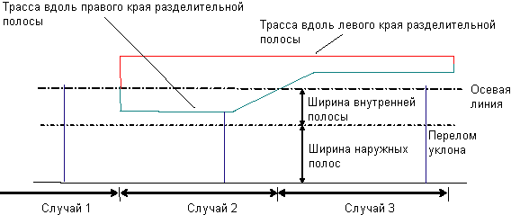 Трасса, определяющая край разделительной полосы, может: отсутствовать (Случай 1), находится вне осевой линии дорожного полотна (Случай 2) или находиться в пределах осевой линии дорожного полотна (Случай 3).