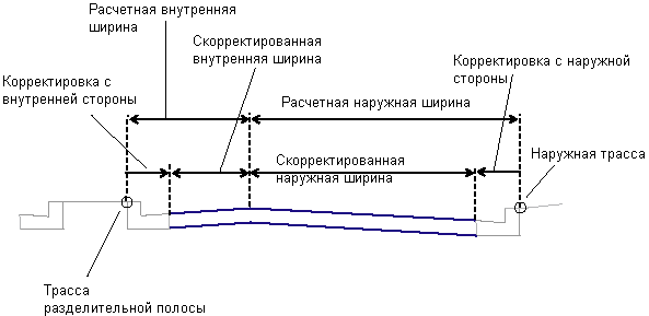 Корректировки с внутренней и наружной сторон: параметры "Корректировка с внутренней стороны" и "Корректировка с наружной стороны" предоставляются в случае, если для внутреннего или наружного края используются трассы, расположенные на фиксированном смещении от действительного края проезжей части. Например трасса, которая используется для "Края разделительной полосы", может находиться внизу бордюра, а не на крае дорожного покрытия. В таком случае параметр "Корректировка с внутренней стороны" должен быть установлен равным ширине бордюра.
