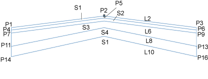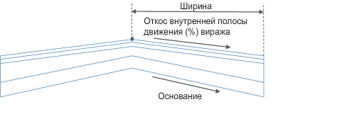 Поперечный уклон виража для параметра "Внутренняя полоса" определяется параметрами виража для трассы базовой линии. Проектная поверхность и параллельное основание с заданной шириной, глубиной и поперечным уклоном виража вставляются, начиная с точки привязки. Вертикальные звенья замыкают форму на одном из концов полосы.